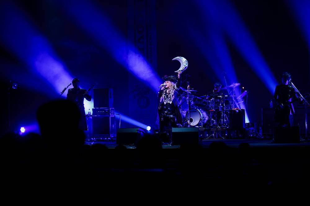 そんなMCの後、「長いツアーで街から街へと旅をする中で生まれた曲」だという『PRECIOUS?』の収録曲を滋味深く聴かせ、渡邉の爪弾く荘厳かつ幻想的なベースソロに導かれ、JILLが三日月のオブジェを左手に掲げながら唄う定番のバラッドを情緒豊かに披露。漆黒の闇と溶け合うように煌々と輝く銀の月がただただ美しい。