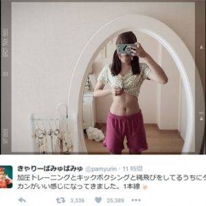 きゃりーは1日に自身のツイッターを更新し、「加圧トレーニングとキックボクシングと縄飛びをしてるうちにタイカンがいい感じになってきました」と報告。そして、「1本線」とコメントを加えて自らのお腹回りの写真を公開した。