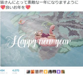 篠田は年が明ける17分前にツイッターを更新。「今年のスタートは新しい年越しだったので2017年楽しみです。皆さんにとって素敵な一年になりますように。良いお年を」との一文とともに、自身の水着写真を使用した新年のグリーティングカードを添えた。