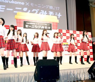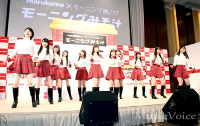 モーニング娘。’17が12日、東京・港区コンラッド東京でおこなわれた『マルコメ新商品「モーニングみそ汁」発表会』に出席、同商品にちなんだ同名の新曲「モーニングみそ汁」を初披露した。また、リーダーの譜久村聖(20)は10日に発表された、モー娘。OBで紺野あさ美・テレビ東京アナウンサーの結婚に「紺野さんとコラボして直接おめでとうと言いたい」とコメント。また、今年でモーニング娘。結成20周年を迎えるにあたり、メンバーが本年の抱負などを語った。