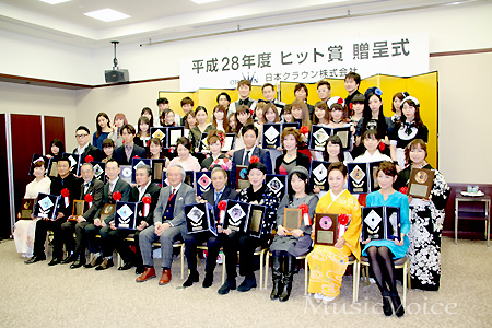 日本クラウン所属の歌手や作詞・作曲・編曲家を表彰する『平成28年度(第53回)日本クラウンヒット賞贈呈式』が27日、都内でおこなわれ、ゴールドヒット賞に三山ひろし「四万十川」、アルバムヒット賞に北島三郎『北島三郎 全曲集 〜涙の花舞台・風雪ながれ旅〜』、新人賞にBAND-MAID『Brand New MAID』などがそれぞれ選ばれた。