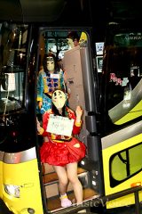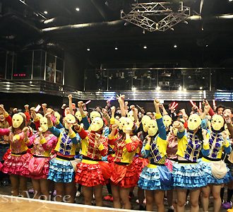 この日のチケット72枚は完売、バスは定刻に仮面女子のメンバーと観客を乗せて出発。仮面女子のホームグラウンドである仮面女子CAFEには、渋滞の影響もあって予定の到着時刻から15分遅れた午後6時過ぎに到着。満足そうな表情を見せる観衆を、メンバーがハイタッチで劇場に迎えた。