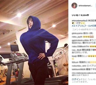 写真は、スポーツジムで撮られたものとみられる。青紫色のパーカーを着こむ篠田のバストはバスケットボール以上の大きさまでに膨れ上がっている。