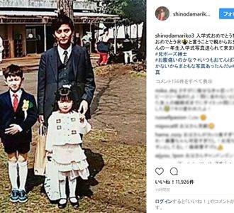 篠田は11日に自身のインスタグラムを更新。「入学式おめでとう社会人おめでとう と言うことで親からお兄ちゃんの一年生入学式写真送られて来ました笑」と報告し、自身が幼少の頃に撮影された父親と兄との3ショット写真を公開した。