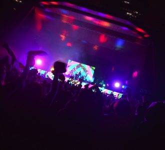 ステージ中央の後方に設置されたスクリーンには、カウントダウンが刻まれる。10分毎にお腹に響くような低音がなる。その音を聞くたびにざわつく会場。1分前になると、オーディエンスは立ち上がり、“ミオコール”があちらこちらから聞こえる。10秒を切ると、9、8、7とオーディエンスも声を出しカウントダウン。期待が高まるなかカウントがゼロになりライブの幕は開けた。