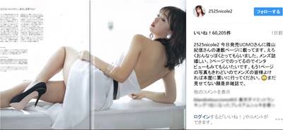 そして、「えろくおんなっぽくとってもらいました。メンズ誌嬉しい。3ページでのってるのでインタビューもみてもらいたいです」と写真のコンセプトを紹介し、「もう1ページの写真もきわどいのでメンズの皆様よければ本屋に買いに行ってください」と男心を誘うかのようなコメントを付け、購入を呼びかけている。