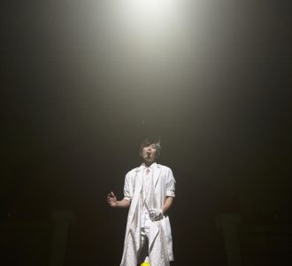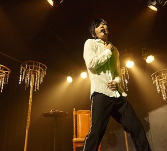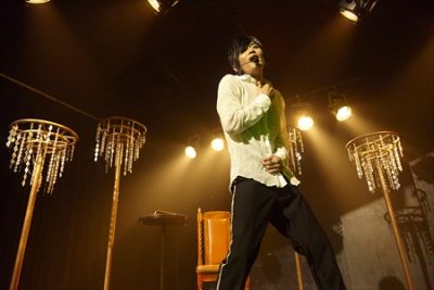 再びステージは暗転。緊張感のなか扉がバタンと閉まる音が鳴る。その音を合図に、ステージ下手にある小さな舞台の扉が横に開く。そこにはパクドルの姿。ステージには、シャンデリアのようなオブジェが3つ。それを手で触りながら歩くパクドル。そのまま椅子に腰をかけて口を開く。「愛ってなんだ…?」。妙な雰囲気に会場からは笑いがこぼれた。