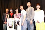 「トモシビ 銚子電鉄6.4kmの軌跡」の初日舞台挨拶をおこなった、左から杉山泰一監督、植田真梨恵、松風理咲、前野朋哉、有野晋哉、富田靖子