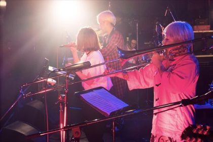 まずはパーカッションとベースが順にソロを披露。その後はサックスとトロンボーンによるセッション。高鳴る興奮のなかで次はグロッケンシュペールとアコギのセッション。相反するサウンドで互いに刺激し合う。異種格闘技戦を見ているように釘付けになる観客は割れんばかりの拍手と歓喜の声を挙げる。その興奮が頂点に達したところでドラムソロが繋ぐ。最後はNakamuraEmiがスキャットのように歌をあげる。
