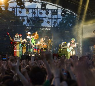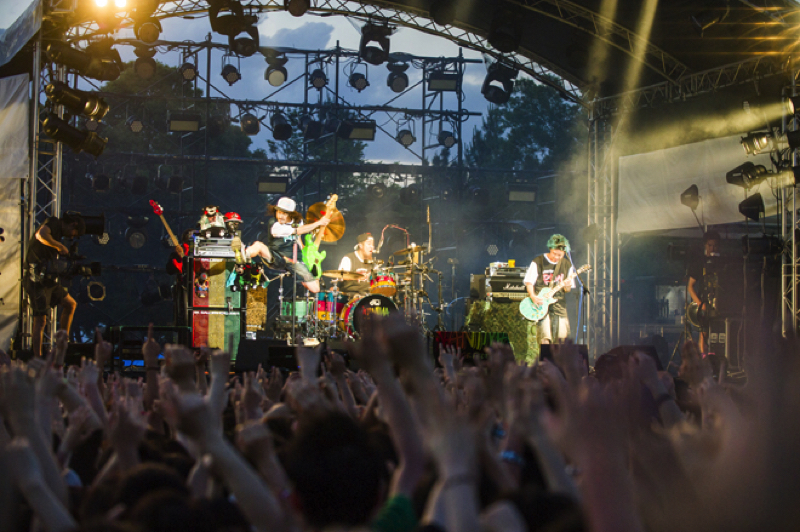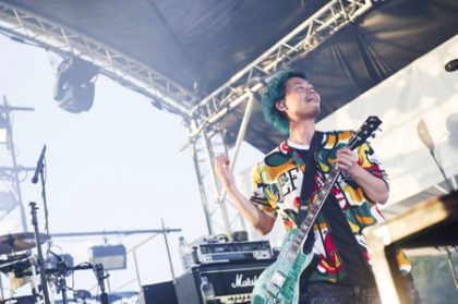 KENTAは「海の近くだとこの曲を歌いたくなるね」と中盤戦では一気に趣を変え「SLOW」を披露。KO-SHINの裏打ちのギターサウンドが夕焼け空のお台場に響く。なんともロケーションにマッチした楽曲。言葉を噛みしめるように、情感を込めて歌い上げるKENTAの表情が印象的であった。日が落ちかけてきたところで、「飛んだり跳ねたりしたいよ〜」とKENTAの言葉から、ファンキーな「オドルヨル」に突入。FUJIの叩き出すビートによって、体は自然と揺れ、なんともエキサイティングなステージに圧倒されていく。