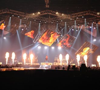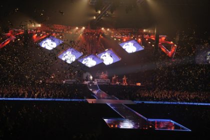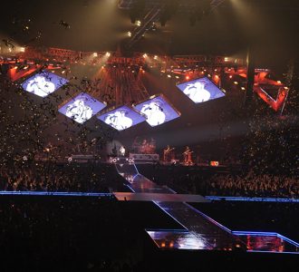 定刻を少し過ぎたところで、会場の明かりが暗転。SEが響き渡るなか、白色の照明がサーチライトのように会場を照らした。メインステージの天井には、可変式の大型パネル5台が設置され、そこに様々な画を映し出した。