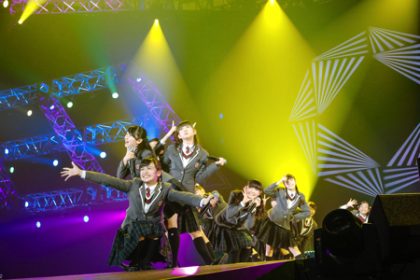 休憩を挟み、後半戦のトップバッターとして登場したのは成長期限定ユニットのさくら学院。学校のチャイムが鳴り響き、12人による合唱から「School days」を届けた。若さ溢れる元気一杯のステージは、観るものに活力を与えてくれる。人数の利点を生かした振り付けが印象的だった「負けるな青春ヒザコゾウ」。サビでの輪唱も。「このようなステージに立つことができて、とっても嬉しいです」と生徒会長の山出愛子。ユニットの説明を丁寧におこない、「夢に向かって」を笑顔で届ける。フラッグを使用した振り付けで、視覚的にも楽しませた。「ありがとうございました、バイバイ〜」と元気一杯にステージを後にした。