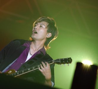 新藤はテレキャスターに持ち替え、ディレイの効いたスペーシーなギターサウンドを響かせるとPerfumeの「ポリリズム」、flumpoolの「君に届け」、さらに高橋優の「福笑い」とメドレーで3曲を、ポルノグラフィティのカラーに染め上げた。「このFesを取り仕切ってくれた3組に敬意を評して、カバーさせて頂きました」と選曲の意図を語り、情熱的なナンバー「オー!リバル」へ。サビでは観客もラテンのリズムを手拍子。楽曲の熱さも相まって真っ赤な炎がステージから吹き出し、さらに観客のテンションは上がっていく。