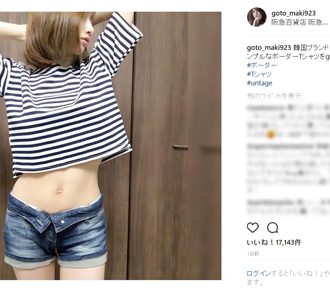 後藤真希は21日、インスタグラムに「韓国ブランド#untage のシンプルなボーダーTシャツをget.」とのコメントを添えて自身の写真を投稿。デニムのショートパンツに、ボーダーのTシャツ姿の後藤。両手を頭の後ろで結んだ格好をしているため、Tシャツの裾は腹部の中央まで上がり、肌身のくびれが露わになっている。