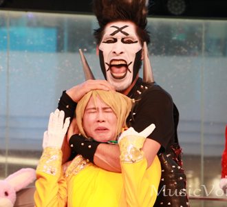 その後、新曲「全開で行こう」を披露。躍動感あるダンスパフォーマンスと歌を届けている最中、ここで巨漢デスメタルバンドのボーカル“シノ爆ロック”に扮した篠原信一が乱入。リズムにノリながら歌唱し、アルスアグナとともにイベントを盛り上げた。