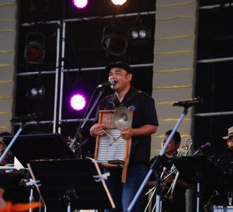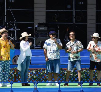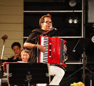 昭和コーナーが終わると、ステージ上には嘉手納町文化協会民謡部のメンバーが登場。これまた今回初チャレンジという「沖縄民謡と、マルシャショーラのコラボ」が始まった。歌われたのは、いずれも嘉手納町にゆかりのある民謡「比謝川小唄」「月眺み」「芋ぬ時代」の3曲。曲間では、ゆったりした三線のリズムにバンドが一瞬戸惑うようすも見られたが、すぐにテンポを把握してリズムを刻み始め、セッションは続いていく。どんなジャンルの音楽とも見事にコラボできてしまう、マルシャショーラの底力を感じた瞬間だった。