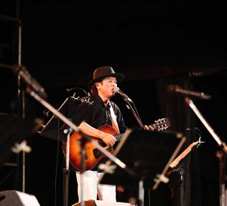 BEGINのステージの後は、嘉手納町連合青年会と千原郷友会による「エイサー演舞」を挟み、21歳の女性シンガーソングライター・藤原さくらが登場。昨年は音楽活動だけでなく、ドラマにも出演して注目を集めた彼女は、実は今日が沖縄初上陸ライブとのこと。アコースティックギターの弾き語りで、ドラマ主題歌の「Soup」をはじめ、「500マイル」「春の歌」など全5曲を熱唱した。いつのまにか太陽が傾き、赤く染まり始めた会場の空に、彼女のスモーキーでキュートな歌声が、伸びやかに心地よく広がっていった。