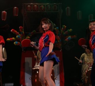 そしていよいよステージはスタートした。第1部は「祭りブロック」と称され、コント芸などを中心に楽しいステージを展開。最初は桃乃木、小島、藤原の3人が卓球のファッションとラケットといういでたちで登場し「ピンポンデューサー」で緊張の空気を徐々に和やかにしていく。卓球・日本代表プレーヤーの福原愛選手のプレーでおなじみの“サー!”という掛け声が、徐々にステージとフロアの間でタイミングを合わせ、彼女らと観衆との距離を縮めていく。さらに三上、辰巳、石岡、市川、羽咲による某アイドルグループのカバー、夏目、川上、湊の3人も某女性ボーカルのJ-POP替え歌で和やかに、そしてアクティブにステージを盛り上げていく。