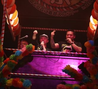 この日のステージのテーマは「夏祭り」。ステージには櫓(やぐら)が組まれ、その上にはお笑い芸人のデッカチャンがDJセットともにステージのスター前から会場を盛り上げる。「さあ皆さん、盛り上がんないとマスカッツは出てこないよ!」デッカチャンの言葉に百も承知とばかりに観衆も手拍子や感性で応え、幕が開く前からすでに総立ちと、熱気ムンムンの会場となっていた。そして「バナナマンゴーハイスクール」から始まるデッカチャンの「マスカッツ・リミックス」で、観衆の期待は最高潮に。
