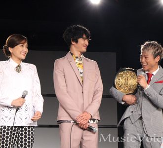 佐藤江梨子と瑛太らが6日、都内でおこなれた映画『リングサイド・ストーリー』(10月14日公開)完成披露上映会に出席。映画で共演した黒潮“イケメン”二郎、武尊(たける)選手と、レフェリー役を務めた有薗芳記、メガホンを取った武正晴監督とともに、撮影を振り返った。またこの日は、司会を関根勤が担当、さらにサプライズゲストとしてボクシングの亀田興毅・大毅兄弟、プロレスラーの武藤敬司も登場した。
