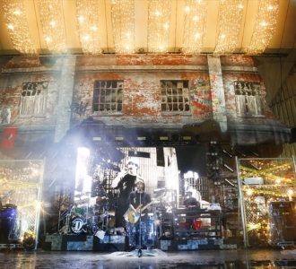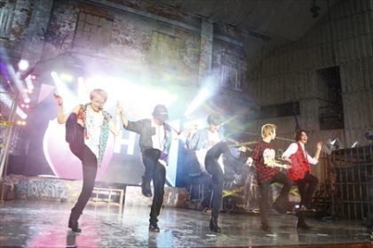 レンガ積みの瓦礫、金網、そして立ち入り禁止を示すテープ。荒廃した街角の一角を表したステージセットが見える中、定刻を15分ほど過ぎたころに大きなサイレンが鳴り響く。警備員風のスタイルの者たちが、慌てたような表情であたりを見回す。ステージに流れる映像、そして大きな空砲の音とスモークがもくもくと広がる中、5人は観客の前に現れた。