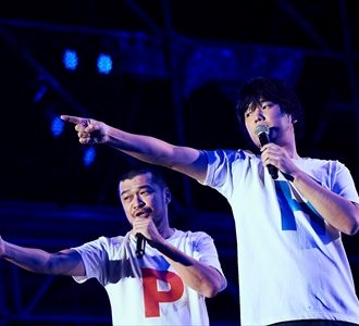 この第2部のひとつのクライマックスは秦と竹原による“はったんぴーちゃん”のコーナーだろう。昨年のオーガスタキャンプで衝撃のデビューを飾った2人のパフォーマンスは、今年のリクエスト企画でも圧倒的な票を集めるほどの大人気。1年ぶりの“はったんぴーちゃん”はさらにパワーアップしていて、そろいの衣装に身を包んだ上、「はったんぴーちゃんはじまりのテーマ」「はっぴー音頭」などの新曲も加え、お待ちかねの「ちゅ・ちゅ・ちゅI want you(ハートマーク)」では場内に爆笑とハッピームードが溢れていた。このオーガスタ発“歌のお兄さんユニット”の今後の展開からは本当に目が離せそうもない。