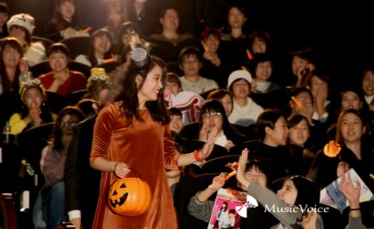 広瀬は「ワンピースが落ち着いた色なので、小物で遊んでみました」とオレンジ色のリストバンドや、帽子などの小物でハロウィーン感を演出。観客からも「かわいいー!」と声が上がった。元ファッションモデルのセンスの高さも光る。