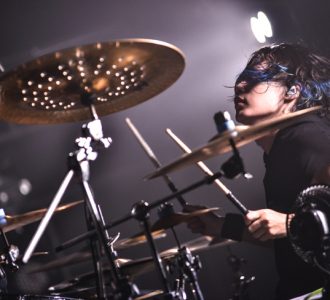 暗転したステージにKANDAI(Dr)が登場し、地響きを感じるほどの力強いドラミングを聴かせ、会場が一気に沸く。どっしりと構え、決して守るだけではない手数の多さは、まるでアニメ『機動戦士ガンダム』で4基のキャノン(ランチャー)を持つガンタンクのごとし(笑)。続いて、kazu(Ba)が加わり重低音のグルーブを響かせる。足を大きく広げ、黙々とプレイする様子は実にスタイリッシュ。陰に徹しながら、ときおりギターのようなメロディフレーズを刺すように聴かせる姿はアサシンだ。