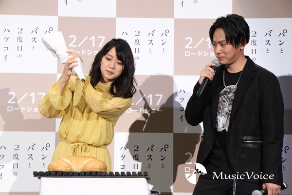 - チョコレートで顔の表情を描いたパンを見せる深川。その間を取り持つ山下健二郎