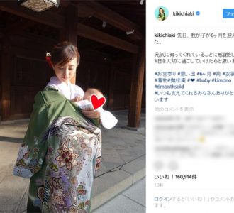- 生後6カ月第一子と宮参りに行ったことを報告する伊藤千晃(Instguramより@kikichiaki)