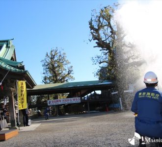 1月26日は、昭和24年に奈良の法隆寺修復時に起きた火災により十二面壁画が焼損したことを機に、文化財を火災から守ろうと設けられた「文化財消防火デー」。都内で初めて「重要文化的景観」として答申されている葛飾・柴又地域の帝釈天題経寺で、地域の絆で文化財を防護することを目的に、金町消防署、金町消防団、帝釈天題経寺自衛消防隊、地元商店街、町会等が協力した消防演習を実施。