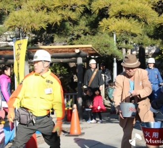 この日は、『男はつらいよ』シリーズで渥美清さんが演じる車寅次郎、“寅さん”のものまねを中心に活動する、お笑い芸人の野口寅次郎がバケツ消火隊長として演習に参加した。地元民がバケツリレーで消火活動演習をおこない、そのアンカーを務めた。