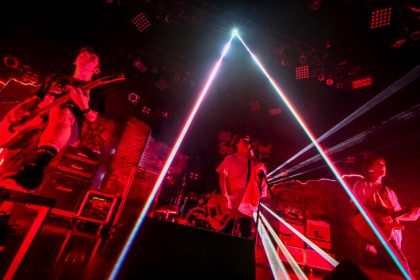 開演時刻になると暗転。ステージを覆っていた幕が開き、SEと共に颯爽とステージに登場した4人。オーディエンスも大歓声で迎い入れた。オープニングナンバーは「Feel」。序盤からアクセル全開の演奏、レーザーが飛び交うライティングは高揚感を煽る。激しさとメロディアスさが絶妙なバランスで聴かせた「knife」と怒涛の攻めの展開。