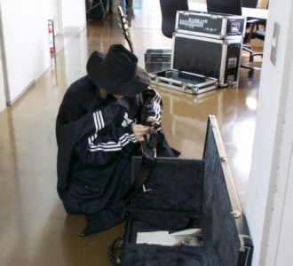 師走に入り、寒さもより厳しくなったこの頃。撮影がおこなわれたこの日は、冷たい風によって体の芯まで冷え切っていた。正午になり、メンバーは控え室で、撮影のためのメイクや衣装合わせをおこなっていた。その場で何着かフィッティングをおこなう。なかでもニューギターを引っさげて撮影に臨む熊谷は「刀っぽいイメージが『銀魂』にも合うし、新しいギターを買うと良いことが起こるんです」と自身のジンクスを語った。