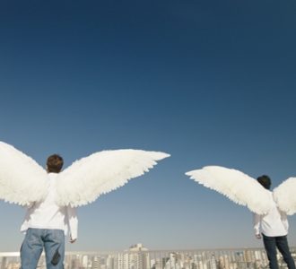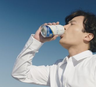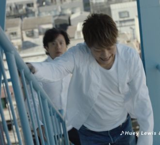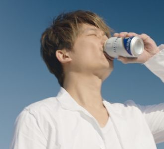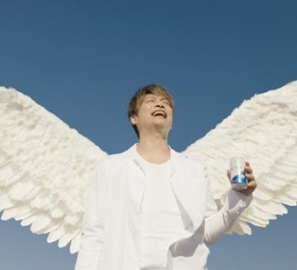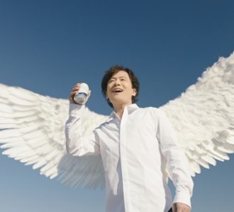 「プハぁ!」と発すると同時に、稲垣と香取の背中に広がる、大きな白い翼。飲んだ後の開放感や気持ち良さを表現する演出のひとつ。青い空に白く映える翼が広がった2人の姿も今回のCMの見どころのひとつとなっている。