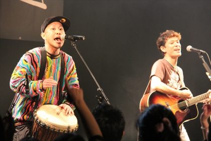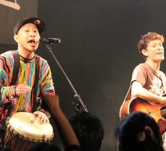 そのとき「もう1曲! もう1曲!」と叫びながら、ジャンベを抱えステージに近づく人の影が。HYのドラマー、名嘉俊のサプライズ登場だ。突然の彼の出現に会場の観客も、また新里自身も大喜び。ラストは新里のギター、ボーカルと名嘉のジャンベ、そして観客の手拍子による、HYの代表的ナンバーの一つでもある「ホワイトビーチ」へ。