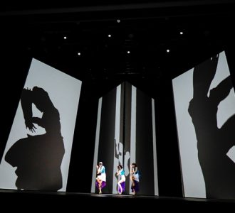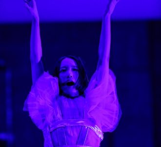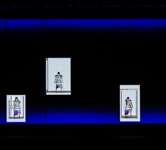 青いフリルのドレスを脱ぐと、近未来的な衣装に早変わり。ステージには4枚の巨大な可動式スクリーンが登場し、それまで色鮮やかにステージを照らしていた照明が白い蛍光色だけのシンプルなものになり3人の影がスクリーンに反映された。