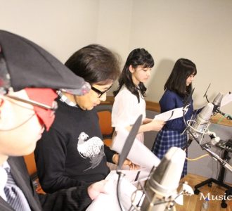 - 声収録に臨む左からゲッターズ飯田、藤巻直哉、栗田桃花、花川芽衣