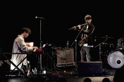 会場は定刻を迎えると暗転、静まり返る場内。やがてステージの上には、WONKのボーカリスト・長塚健斗を除いた3人のメンバーと、サポートメンバーでギター、サックスプレーヤーの安藤康平が、拍手に迎えられ登場した。かと思うと、突然バスドラを強く連打する音が会場に響く。意表を突いたそのプレーはやがてドラムソロに変化、さらにキーボートのコードが絡み、続いてベース、ギターがそのセッションに加わっていくと、その音は一つの曲のアウトラインを描き始める。
