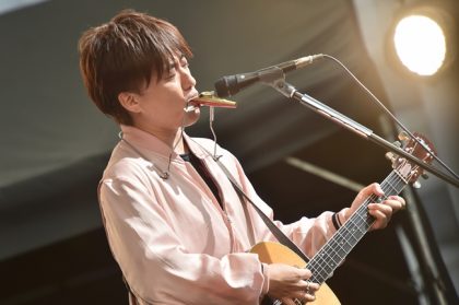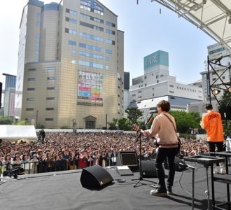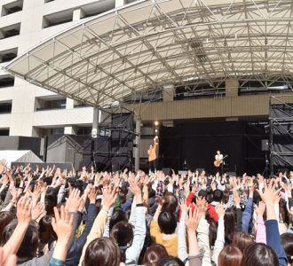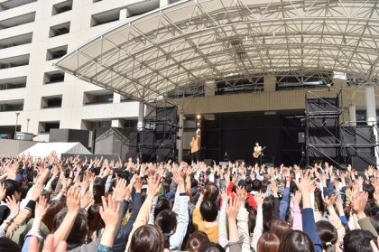 続いて、ニューシングルから表題曲「ONE TIMES ONE」をアコギ1本で初披露。“人との出会いが無限大の可能性を持っている”ことを歌っているこの曲。屋外での初披露に訪れた人は歓喜を挙げた。