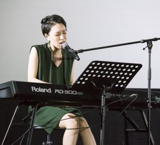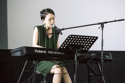 作品の上映が終わってからイベントがスタート。笹川が緑のノースリーブ姿で登場。右手で鍵盤をぽろんと弾いてから、段々とギアが上がる様な形で演奏が始まった。そして<キッチンにはハイライトとウィスキーグラス/どこにでもあるような 家族の風景>、煙が浮かぶ様な歌が放たれると会場の空気が変わる。最後の1音を弾き終えると、彼女は笑った。