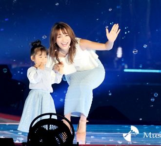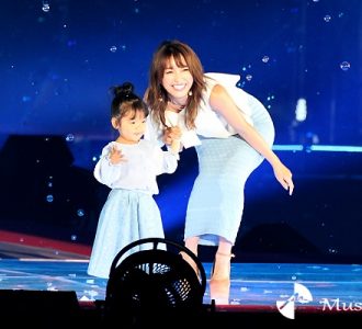 手をつなぎ登場。大歓声に手を振りながらランウェイを歩く2人。先端に到着したところで、優樹菜が茉叶菜ちゃんと同じ目線までしゃがむと、投げキッス。茉叶菜ちゃんも見様見真似で投げキッスの仕草をした。