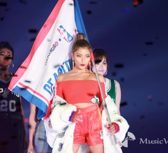 その後、楽天NBAのステージにサプライズ登場。再び熱気に包まれる場内の中央に伸びるランウェイを、ローラはクールな表情でフラッグを振り回し登場。あたかも凱旋のように割れんばかりの歓声を浴びた。