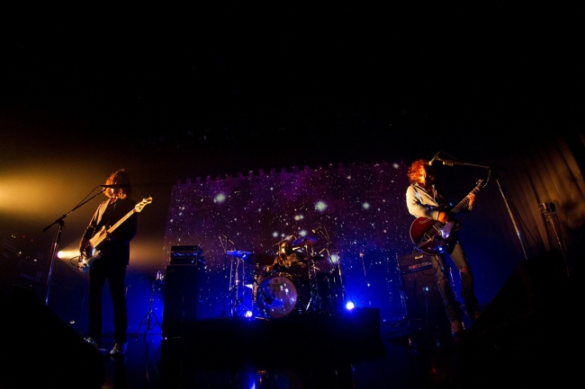 ステージスタートの直前には、どこからともなく「ベンジー!(浅井のニックネーム)」と叫ぶ声が。その声は周りに徐々に伝播し、一つの渦のような、大きな熱気のかたまりを形成していった。スタート予定時刻を10分ほど過ぎたころ、暗くなった会場の中で、ステージの後に大きな「Welcome!」という言葉がプロジェクターで映し出された。いよいよ彼らは、大きな歓声と拍手に迎えられステージに現れた。そしておもむろに中尾がベースのリフを弾き始めると、徐々に浅井がギターの音を絡みつけ始める。さらにそれに合わせ小林がリズムを刻むと、いよいよこの日のショーの幕は開かれた。