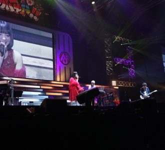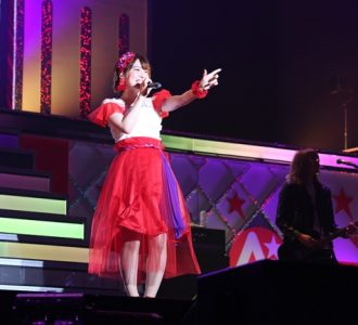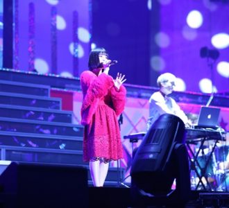 アコースティックギターを弾きながら、透明感溢れる歌声を聴かせた大原ゆい子は、「可愛い!」と客席から声がかかると、照れくさそうにはにかんだ。大原は、TVアニメ『からかい上手の高木さん』OPテーマ「言わないけどね。」と、TVアニメ『リトルウィッチアカデミア』EDテーマ「星を辿れば」の2曲を披露。アツいステージを繰り広げたi☆Risから一転、爽やかな風が吹き抜けるような歌声で、会場は一気にチルアウトしたムードになった。MCでは「今日は、私の地元である千葉の幕張メッセで歌えてうれしいです。昨年の代々木(第一回目の「あにゅパ!!」は昨年、国立代々木競技場 第一体育館で開催)で客席から見ていたので、今年はステージに立つ側で参戦できて本当にうれしいです」と、よろこびをにじませていた。