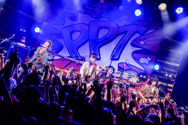 PPTと書かれたペイントが目を惹く巨大なバックドロップには、“DANGER”や“CAUTION”のバリケードテープが張り巡らされ、危険な雰囲気を開演前から匂わせていた。フロアからは現実世界から開放させてくれる破天荒なライブへの期待感で満ちていた。