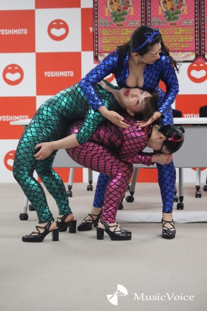 発表会の予定時刻がくると、服部ひで子、森田まりこ、岡田直子による爆乳三姉妹が登場。会見場となった会議室に響き渡る大声でショートコントを3つ披露し、ツカミをクリアしたところに小藪が登場した。