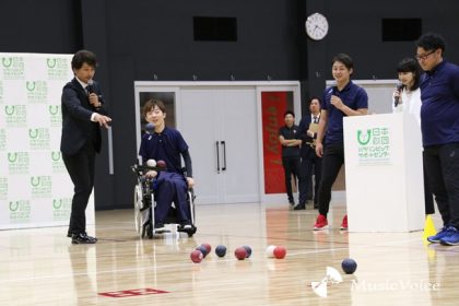 また、贈呈式後には3人がボッチャに挑戦。杉村選手、アンドリュー氏、山脇氏のチームと対戦した。ボッチャは白いジャッジボールと呼ばれるボールに、手投げでどれだけ自軍のボールを近づけられるかを競う競技。カーリングとルールは似ているが、大きく違うところはジャッジボールを動かすことが出来るということ。