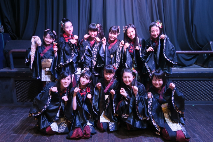 民謡ガールズ集合写真 (上段左から:ゆとり、りな、らむ、ゆうあ、いずみ、りお、 下段左から:かこ、みやび、りょう、まつり、みのり)
