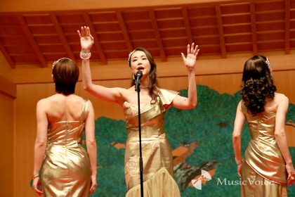 会見では同公演でも歌唱予定の松任谷由実「ANNIVERSARY」を3人で歌唱。ハリウッドでも話題になった映画『ドリームガールズ』を意識したという金色のドレス姿に神聖な舞台のため足袋を着用した3人が、しっかりとした力強い歌声を会場に響かせた。